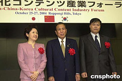 第三屆中日韓文化產(chǎn)業(yè)論壇二十五日在東京舉行。這個由三國主管官員和業(yè)界人士參加的新型論壇,是兩年前在中國上海創(chuàng)辦的。中國文化部副部長孟曉駟(左)、日本經(jīng)濟產(chǎn)業(yè)府大臣保坂三藏(中)和韓國文化觀光部副部長裴鐘信參加開幕儀式。作者:王健