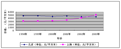 但從動態(tài)上看,商品房空置面積并沒有增加,而是呈下降趨勢。2004年8月底,商品房空置面積0.97億平方米,同比減少0.8%,比去年底減少3%。這說明當前的房地產空置問題并未惡化。我們認為,對于房地產空置現(xiàn)象,必須從兩個方面認識:一方面,房地產空置占壓大量資金,其中部分形成不良資產;另一方面,一定規(guī)模的空置對正常的房地產市場是完全必要的,它實際上在某種意義上是一種“庫存”,從而發(fā)揮平抑房價的作用。從圖3的對比可以看出,上海市近幾年房地產供銷兩旺,不僅沒有出現(xiàn)大量空置,連部分以前積壓的房子也賣出去了,而房價表現(xiàn)為一路飆升;北京市則房價比較穩(wěn)定,甚至穩(wěn)中有降,其中房地產空置對房價上升起到的抑制作用不可忽視。