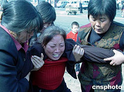 據國家安監(jiān)局網站消息,河南省鄭州煤電(集團)有限責任公司大平煤礦二十日二十二時十分發(fā)生的瓦斯突出事故截止25日20:30已找到122名遇難者,仍有26人被困于井下。救援工作仍在進行之中。圖為在礦難現場外悲痛欲絕的大平礦難家屬。作者:王迪