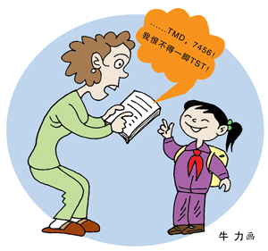 家住天津市和平區(qū)的許女士無意間發(fā)現(xiàn)女兒的日記中有這樣的文字:“……沒想到我最要好的朋友竟欺騙我,TMD(他媽的),7456(氣死我了),我恨不得一腳TST(踢死她)!痹S女士看后不知所云,直到女兒一番解釋她才明白過來。許女士無奈地對記者說:“這是什么話呀,日記本成了密碼本,根本看不明白!看來我和孩子之間已經(jīng)有了‘網(wǎng)絡(luò)溝’。”