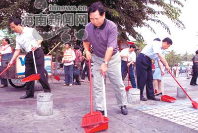 南國(guó)都市報(bào)報(bào)道,26日上午8點(diǎn)50分,海南省委副書記、省長(zhǎng)衛(wèi)留成在?诤P銝|路明珠廣場(chǎng)前,拿著掃把和簸箕,順著路面一直往東清掃過(guò)去,碰到粘在路面上的紙片、桔子皮,就蹲下身去把它們摳出來(lái)。