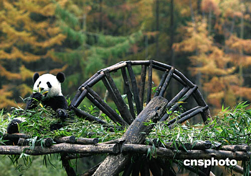 深秋時節(jié),四川臥龍大熊貓保護(hù)基地層林盡染,基地幼兒園的大熊貓寶寶無憂無慮地嬉戲于這片人類精心建造的、與大自然接壤的“大熊貓樂園”中。中新社記者:任晨鳴