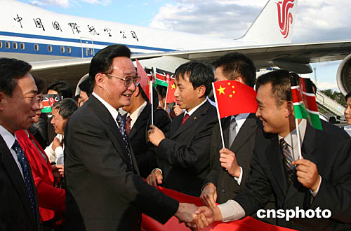 中新社內(nèi)羅畢十月二十九日電(記者張量)當(dāng)?shù)貢r(shí)間二十九日下午,中國(guó)全國(guó)人大常委會(huì)委員長(zhǎng)吳邦國(guó)抵達(dá)內(nèi)羅畢國(guó)際機(jī)場(chǎng),開始對(duì)肯尼亞為期四天的正式友好訪問(wèn)。