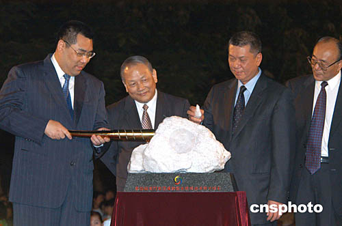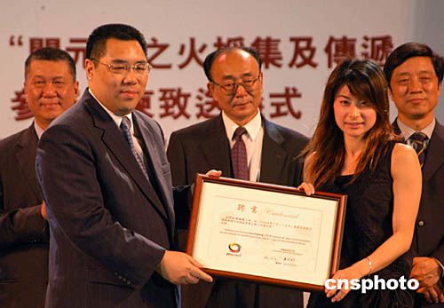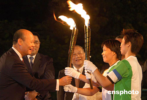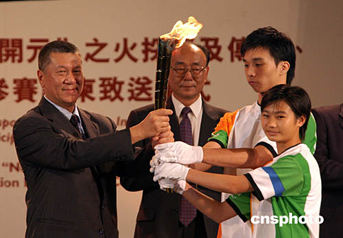 澳門特首何厚鏵在金蓮花廣埸接過(guò)中國(guó)雅典奧運(yùn)金牌得主勞麗詩(shī)和澳門運(yùn)動(dòng)員李廣祥傳遞的“開(kāi)元”之火火炬