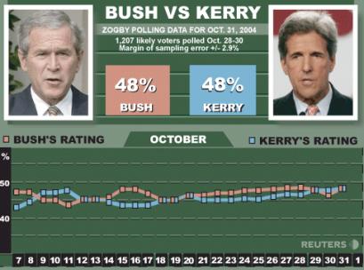 而路透/佐格比(Zogby)上周日公布的最新民調顯示,布什和克里再度打成平手。布什和克里在這項三天的全國追蹤民調中,均獲得48%的支持率,三天當中有一天是在播出奧薩馬錄影帶后進行調查。此前,克里在上周六的調查中以47%比46%,領先布什1個百分點。目前只有2%的選民尚未做出最后決定。