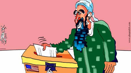 | 中新網(wǎng)11月1日電 10月29日晚,銷聲匿跡一年多的本拉登,在美國(guó)大選投票日來臨的前四天突然拋頭露面了。在半島電視臺(tái)播放了本拉登講話的錄像帶之后,分析家一致認(rèn)為拉登此次露面是為了給美國(guó)大選施加影響,試圖影響美國(guó)大選的最終結(jié)果。半島電視臺(tái)網(wǎng)站于今日發(fā)表了一幅漫畫,在這幅漫畫當(dāng)中,本拉登被描繪成一個(gè)重量級(jí)選民,他的講話被戲稱作是在為美國(guó)總統(tǒng)大選提前投票。(章田)