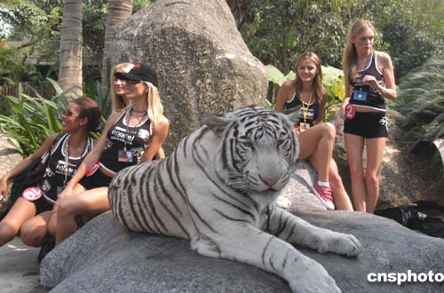 二零零四星際世界模特大賽全球總決賽入圍的五十多名選手,十一月二日首次亮相廣州長隆夜間動物世界進(jìn)行形體展示和外景拍攝。作者:劉衛(wèi)勇