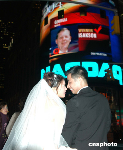 十一月二日美國(guó)大選日,一對(duì)華裔新人特意安排這一天在紐約結(jié)婚。晚上,新婚夫婦身著禮服,來到紐約時(shí)代廣場(chǎng),一邊觀看大選結(jié)果揭曉的現(xiàn)場(chǎng)直播,一邊請(qǐng)人拍攝結(jié)婚紀(jì)念照。作者:龔文謨