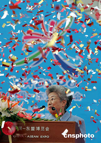 圖為中國國務(wù)院副總理吳儀宣布南博會開幕。