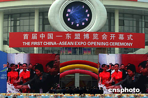 中國國務(wù)院副總理吳儀、柬埔寨首相洪森、老撾總理本南、緬甸總理梭溫、泰國副總理比尼、越南副總理范家謙等中國、東盟國家的政要,在開幕式上一起按下“時代之鐘”。