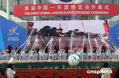 中國國務(wù)院副總理吳儀、柬埔寨首相洪森、老撾總理本南、緬甸總理梭溫、泰國副總理比尼、越南副總理范家謙等中國、東盟國家的政要,一起為中國東盟博覽會開幕式剪彩,將來自中國和東盟各國江河湖海、象征著雙方合作源遠流長、生生不息的清純之水傾入瓶中。