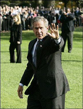 中新網(wǎng)11月3日電 據(jù)法新社報(bào)道,11月2日,在奔波了數(shù)州拉票之后,布什總統(tǒng)乘坐“海軍陸戰(zhàn)隊(duì)一號(hào)”直升機(jī)回到白宮,等待選舉結(jié)果。圖為布什下機(jī)之后,向民眾揮手致意,臉上充滿了疲倦,但也顯示出他的自信。(春風(fēng))