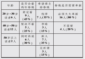 在“最喜歡的演員”中,趙本山、宋丹丹獨占鰲頭,獲得半數(shù)以上讀者推薦;而“最不喜歡的演員”中,陳佩斯則遭到4位觀眾的“彈劾”。在節(jié)目上,12位讀者認(rèn)為小品、相聲應(yīng)該加強,歌舞應(yīng)該減少,8位讀者表示節(jié)目時間太長。