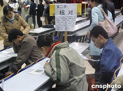 2005年全國碩士研究生招生首次在全國范圍內(nèi)試行網(wǎng)上報(bào)名,考生須于11月10日至14日到省級(jí)招生辦指定的報(bào)考點(diǎn)確認(rèn)報(bào)名信息才能有效。圖為報(bào)考中國人民大學(xué)碩士研究生的學(xué)生11月10日在現(xiàn)場(chǎng)仔細(xì)核對(duì)自己的報(bào)名信息。作者:張碩