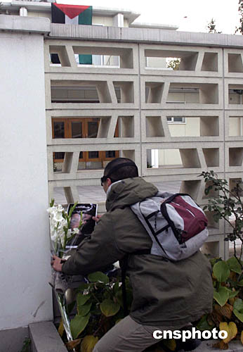 十一月十一日下午,由一些北京市民和學(xué)生自發(fā)敬獻(xiàn)的一簇簇鮮花擺放在巴勒斯坦國(guó)駐華使館門前,表達(dá)他們對(duì)巴勒斯坦國(guó)總統(tǒng)、巴民族權(quán)力機(jī)構(gòu)主席阿拉法特的哀悼。阿拉法特當(dāng)天在法國(guó)巴黎病逝。中新社記者:張煒