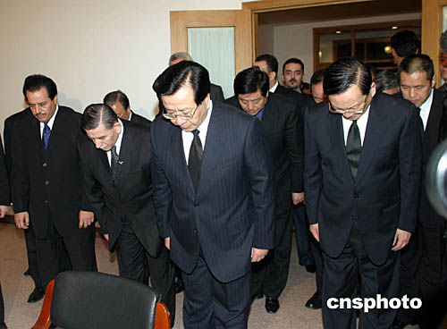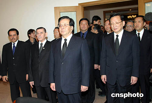 中新社北京十一月十一日電 (記者李靜)中國(guó)國(guó)家副主席曾慶紅十一日到巴勒斯坦國(guó)駐華使館,代表中國(guó)政府吊唁巴勒斯坦國(guó)總統(tǒng)、巴勒斯坦民族權(quán)力機(jī)構(gòu)主席亞西爾·阿拉法特逝世并敬獻(xiàn)花圈。國(guó)務(wù)委員唐家璇陪同前往吊唁。