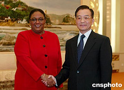 中新社北京十一月十二日電(記者李靜)中國(guó)國(guó)務(wù)院總理溫家寶今天下午在人民大會(huì)堂會(huì)見(jiàn)了來(lái)華訪問(wèn)的巴巴多斯副總理莫特利,雙方就中巴關(guān)系交換了意見(jiàn)。