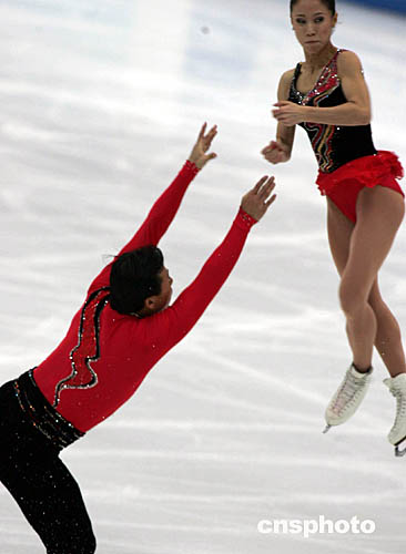 世界頂級組合之一的中國金牌搭檔申雪/趙宏博,11月12日晚在北京舉行的世界花樣滑冰大獎賽中國站雙人滑自選動作比賽中,憑借新編排的《宋氏王朝》之精彩表演獲得冠軍。申雪/趙宏博的最終目標是2006年的冬季奧運會金牌。中新社記者:任晨鳴