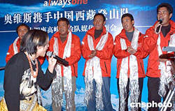 西藏登山隊(duì)明年將與奧維斯體育文化傳播公司繼續(xù)共同推進(jìn)“2004-2008地球第三極珠峰環(huán)保大行動(dòng)”,清理海拔6500米-8000米間的登山遺棄物。十一月十三日,合作雙方在北京秀水南街的一個(gè)西藏風(fēng)情餐吧舉行媒體見(jiàn)面會(huì),圖為登山隊(duì)隊(duì)長(zhǎng)桑珠(右五)、橫跨珠峰第一人次仁多吉(右四)、13高峰攀登者邊巴扎西(右三)、仁那(右一)及雪山之子洛則與公眾見(jiàn)面。中新社記者:鄒憲