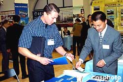 不少美國人今天一早就來到洽談會現場咨詢和索取資料,其中一些人從來沒有學過中文,但對中國文化充滿興趣。還有一些人則希望能到中國進修,為自己未來的發(fā)展增加能量。參展的十所中國名校中有七所接收外國留學生超過一千人,他們今天圖文并茂地向來訪者介紹學校課程設置、教學設施、教學質量等留學信息。