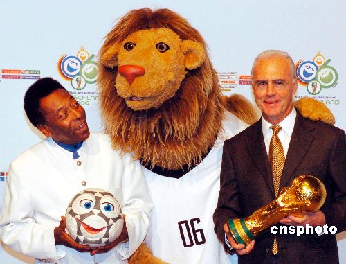 當(dāng)?shù)貢r間11月13日,德國2006世界杯組委會在萊比錫舉行新聞發(fā)布會,吉祥物——一頭精力充沛的“雄師”(中)與“球王”貝利(左)、德國昔日足球巨星貝肯鮑爾(右)一同亮相。Ic/cnsphoto