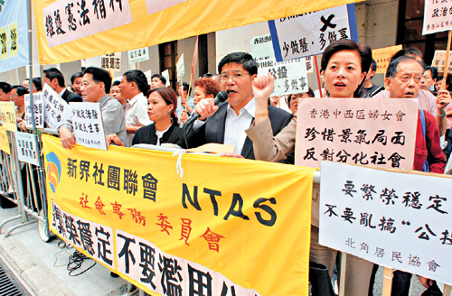 包括新界社團聯(lián)會、香港島各界聯(lián)合會、中西區(qū)婦女會、北角居民協(xié)會等多個團體的數(shù)十名代表昨天一早齊集于立法會大樓外,手持“珍惜景氣局面、反對分化社會”、“要繁榮穩(wěn)定、不要亂搞‘公投’”、“反對做騷、要多做實事”等抗議標語,并高叫口號,強烈反對“公投”動議。
