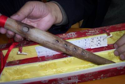 據(jù)收藏者介紹,“這支陶笛為商周時期文物,中國目前只有這一支,就連中國歷史博物館里也沒有!庇浾呖吹,陶笛長20多厘米,大小如蠟燭一般。和普通的竹笛不同的是,它不但是陶制的,而且兩端封口,笛筒并不像一般的笛子那樣均勻,而是呈中間大兩端小的形狀。奇特的是,它的氣孔下面只有4個音孔。主人說,由于中國古代的音樂不成熟,所以管樂的音孔最早只有一個,后來到唐代才發(fā)展到了6音孔!澳銊e看只有4個音孔,但音階很全,古樂、民樂都能演奏!闭f著,他拿起這支陶笛,吹起了《小河淌水》、《青春舞曲》。聽到3000多年前的樂器發(fā)出迷人聲音,現(xiàn)場的人都陶醉了。