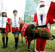 臺北區(qū)一“立委”候選人穿著圣誕老人的服裝搶鏡,但鋒頭卻被自己帶來的辣妹助選團搶光,他只好「騎牛上陣」。不過這位人士一身紅衣,旁人都捏了一把冷汗,深恐牛兒見紅抓狂。
