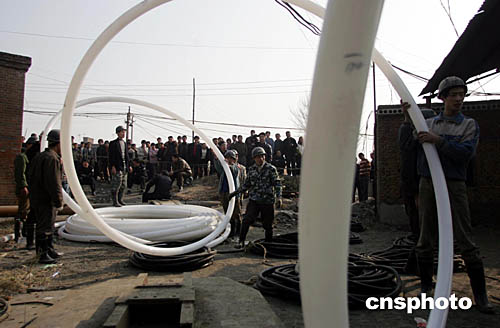 十一月二十三日,“11.20”河北省沙河礦難救援工作仍在進(jìn)行,救援人員向井下運(yùn)送水管以排干被水淹沒(méi)的巷道。截止當(dāng)日中午,遇難礦工人數(shù)已達(dá)五十七人,另有八人下落不明。據(jù)有關(guān)方面透露,被困礦工人數(shù)仍有可能增加。中新社記者:武仲林