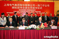 十一月二十三日,上海西門子燃?xì)廨啓C部件有限公司成立簽約儀式在滬舉行。該公司是由西門子公司和上海電氣集團股份有限公司共同投資五千五百萬歐元合作成立的。圖為簽約儀式現(xiàn)場。作者:湯彥俊