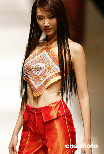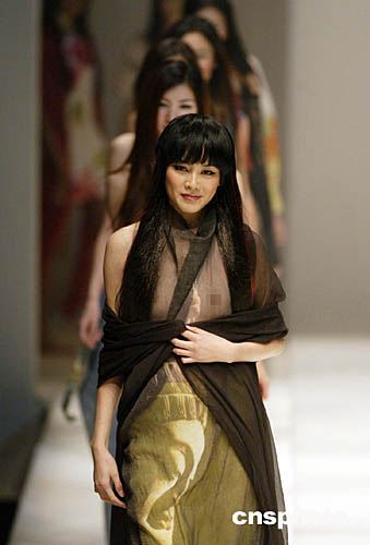 | 十一月二十四日,在中國國際時裝周北京飯店進(jìn)行的著名時裝設(shè)計(jì)師梁子的天意二零零五春夏時裝發(fā)布會上,模特將設(shè)計(jì)師以水為主題、展現(xiàn)生命的和平、健康和魅力”的設(shè)計(jì)理念演繹得淋漓盡致。中新社記者:盛佳鵬