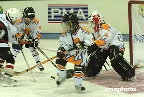 2004年亞太區(qū)少兒冰球賽25日在香港西九龍中心舉行﹐北京尚美虎仔隊(黑衣)以六比零戰(zhàn)勝香港隊。