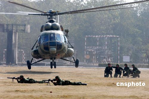 反恐應(yīng)急分隊(duì)機(jī)降突擊隊(duì)搭乘運(yùn)輸直升機(jī)機(jī)降后迅速組織戰(zhàn)斗 。