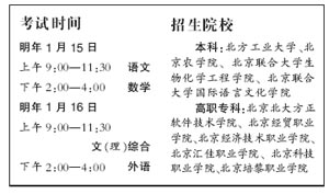 2005年春季高考將于明年1月15日、16日舉行。面向北京招生1542人,比去年增長42人。其中本科招生300人,高職?普猩1242人。