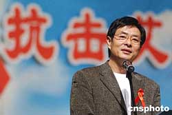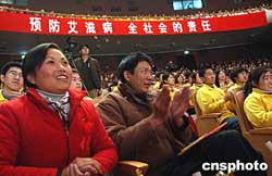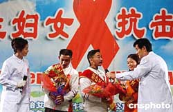 十二月一日,中國內地演員濮存昕(右一)、蔣雯麗(左一)在“關注婦女,抗擊艾滋”活動上,與來自四川資中公民鎮(zhèn)的艾滋病毒攜帶者同臺獻藝,該艾滋劇團是由四川資中縣近二十名艾滋病感染者自發(fā)組建的。作者:韓藝冰