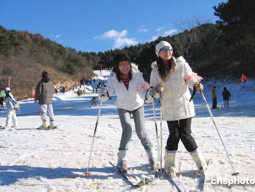 一場清風吹散了持續(xù)三日的大霧,北京十二月四日迎來了藍天白云的好天氣。許多北京市民紛紛涌至郊區(qū)滑雪場放飛心情。僅北京密云云佛山滑雪場就迎來了上萬名滑雪愛好者。圖為兩名女青年在滑雪場盡情嬉戲。作者:吳慶才