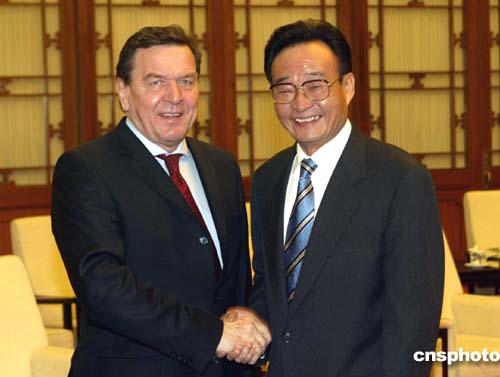 施羅德贊同吳邦國對德中關(guān)系的評價。他說,中德關(guān)系建立在相互信任的基礎(chǔ)上,各個方面的合作都很好。德國政府重視德中關(guān)系,將繼續(xù)堅持一個中國政策。德方愿進一步加強兩國議會業(yè)已存在的良好合作關(guān)系。同時,愿繼續(xù)加強與中國的民間交往,以及文化交流。德方愿與中方一道使德中關(guān)系始終保持高水平的發(fā)展。