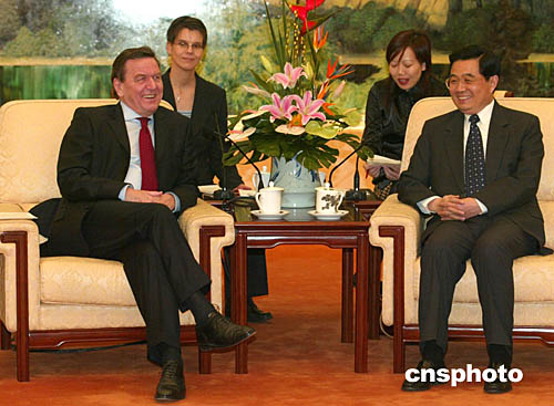中國(guó)國(guó)家主席胡錦濤十二月七日在北京會(huì)見(jiàn)德國(guó)總理施羅德。中新社記者:滿(mǎn)會(huì)喬