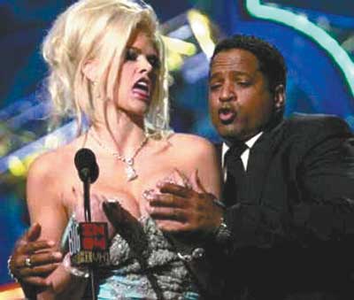 VH1音樂頻道2004頒獎(jiǎng)晚會(huì)日前在洛杉磯舉行,安娜·尼科爾·史密斯也應(yīng)邀參加,不知為何,當(dāng)她走到舞臺(tái)上后,突然脫去了裙子,露出了自己的雙乳,及時(shí)趕到的保安用手盡量遮擋住她的乳房,強(qiáng)行將她拉到了后臺(tái)。據(jù)一位觀眾說:“當(dāng)時(shí),史密斯看起來非常興奮,就在她脫裙子的一瞬間,一名保安把她拉到了后臺(tái)!笨墒牵搅撕笈_(tái)后史密斯仍然不老實(shí),她甚至想讓攝影師給她拍裸照。前不久,史密斯在參加美國音樂頒獎(jiǎng)晚會(huì)時(shí),也因精神恍惚、吐字不清令觀眾無法聽懂她在說什么,還一度趴在臺(tái)上睡覺,結(jié)果主持人打斷了她的講話,將她請下舞臺(tái)。有消息說,她當(dāng)時(shí)要么是喝醉了,要么就是受到了吸毒的影響,但她的律師解釋說,由于這位名模的視力不太好,所以無法看清自動(dòng)提詞機(jī)上的文字。