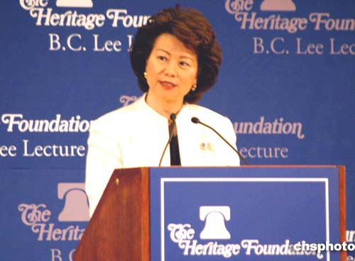 今年五十一歲的趙小蘭是美國第二十四任勞工部長,她是二00一年一月二十九日由美國參議院批準就任的,從而成為美國歷史上第一位躋身內(nèi)閣的亞裔女部長。擔任勞工部長之前,趙小蘭曾擔任過美國交通部副部長和美國交通部航運署副署長等公職。