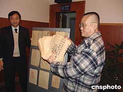 十三日下午,專程從臺(tái)灣趕來的原南京審判日本戰(zhàn)犯軍事法庭審判長(zhǎng)石美瑜遺孀石沈和玉攜子石南陽,向侵華日軍南京大屠殺遇難同胞紀(jì)念館捐贈(zèng)了南京審判日本戰(zhàn)犯軍事法庭的起訴書、判決書、會(huì)議記錄、詢問記錄、照片、書籍等一百一十七件珍貴史料。圖為捐贈(zèng)現(xiàn)場(chǎng)。作者:王曉紅