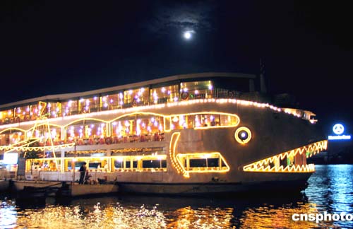 越南近年發(fā)展旅游業(yè),在西貢河邊可載三千游客的巨型鯊魚(yú)游船燈火通明,游客夜游西貢河別有一番風(fēng)情。作者:周景洛