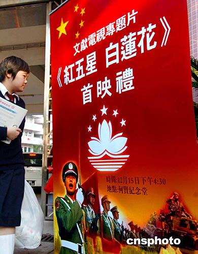 中新社澳門十二月十五日電(記者黃鴻斌)為慶祝澳門回歸祖國五周年而開拍的八集文獻(xiàn)電視專題片《紅五星•白蓮花》拍攝完成,十五日下午在濠江中學(xué)何賢堂舉行盛大首映禮。澳門特區(qū)政府社會文化司司長內(nèi)崔世安、中聯(lián)辦宣傳文化部部長孔繁壯、駐澳部隊副司令黃文科大校等聯(lián)合主持首映禮儀式。