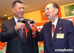 何厚鏵與馬萬祺(右)相互敬酒問候。作者:宋吉河