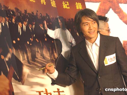 由周星馳自編﹑自導(dǎo)﹑自演耗時(shí)兩年多拍攝的影片《功夫》16日晚在香港時(shí)代廣場(chǎng)舉行首映開(kāi)幕禮﹐在片中擔(dān)任主要角色的周星馳在“影片”《功夫》上簽名,該片將在12月23日在全球上映。作者:趙振清