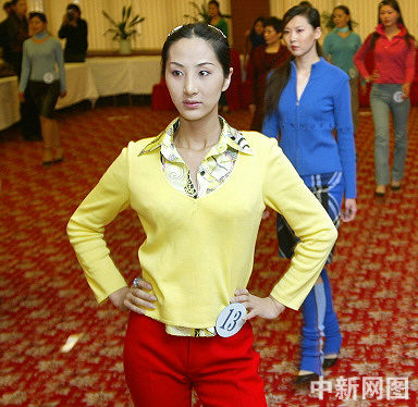 變性人劉小靜與其他參賽選手們練習(xí)臺(tái)步,她們?yōu)橹袊讓谜涡〗愦筚愖鲎詈笠淮尾逝。整形是世界選美的一大禁忌,而19名參賽選手將于12月18日在北京角逐全國“人造美女”稱號(hào)。