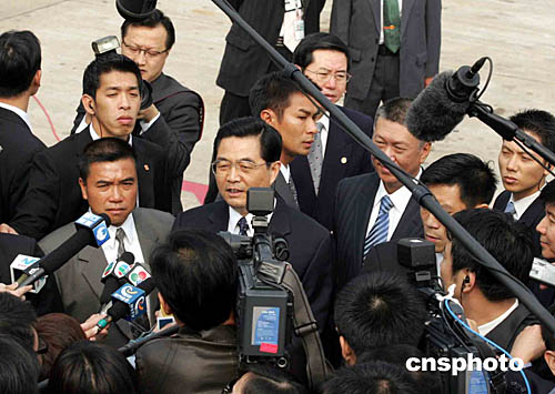 胡錦濤在澳門機(jī)場(chǎng)向記者發(fā)表講話。胡錦濤十九日上午抵達(dá)澳門國(guó)際機(jī)場(chǎng),走下舷梯后隨即向前來采訪的記者發(fā)表了簡(jiǎn)短的講話。作者:宗金柱