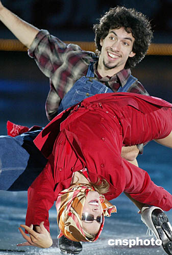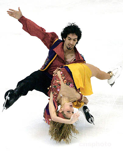 二零零四年十二月十八日晚在北京首都體育館舉行的世界花樣滑冰大獎賽總決賽冰舞比賽中,各國選手爭相斗艷,上演了一曲曲美侖美奐的冰上盛宴。圖為奪得亞軍的美國選手貝爾賓/阿岡索在比賽中。中新社記者:武仲林
