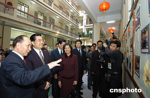 胡錦濤與夫人劉永清在澳門特首何厚鏵的陪同下參觀澳門勞工子弟學(xué)校,受到學(xué)校師生的熱烈歡迎。