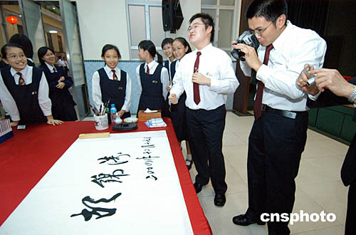 國家主席胡錦濤在參觀澳門勞工子弟學校時寫下了“胡錦濤”三字墨寶,引來學生爭相拍攝。